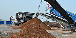 整個項目由智能控制系統(tǒng)統(tǒng)一操作,物料由裝載機進入KE860-1粗碎移動站破碎至180mm以下,破碎后的物料經皮帶機輸送至兩個4000×4000的中轉料倉,再由料倉下方的振動給料機和皮帶機輸送至兩臺KH300-2中細碎篩分移動站進行二次破碎至50mm以下,破碎后的物料由兩臺皮帶機送往振動篩進行篩分,篩分出0-5mm、5-25mm和25-50mm三種物料,0-5mm的物料由兩臺皮帶機送往料堆,5-25mm的物料由皮帶機輸往KV9532-2細碎整形篩分移動站進行整形篩分,25-50mm的物料則由HPT300多缸液壓圓錐破碎機進行再次破碎,直至達到25mm以下為止。