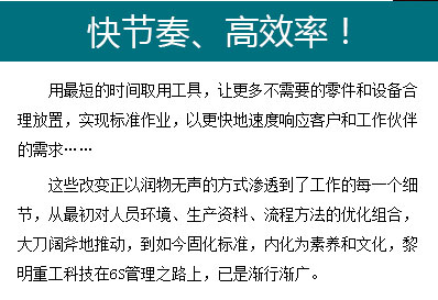 這些改變正以潤物無聲的方式滲透到了工作的每一個細(xì)節(jié),從開始對人員環(huán)境、生產(chǎn)資料、流程方法的優(yōu)化組合,大刀闊斧地推動,到如今固化標(biāo)準(zhǔn),內(nèi)化為素養(yǎng)和文化,黎明重工科技在6S管理之路上,已是漸行漸廣。
