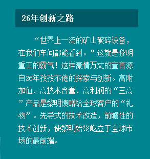 “粗中細(xì)超細(xì)碎的礦山破碎設(shè)備,在我們車間都能看到?!边@就是黎明重工的霸氣!這樣豪情萬丈的宣言源自26年孜孜不倦的探索與創(chuàng)新。高附加值、高技術(shù)含量、高利潤的“三高”產(chǎn)品是黎明饋贈給全球客戶的“禮物”。先導(dǎo)式的技術(shù)改造,前瞻性的技術(shù)創(chuàng)新,使黎明始終屹立于全球市場的前端。